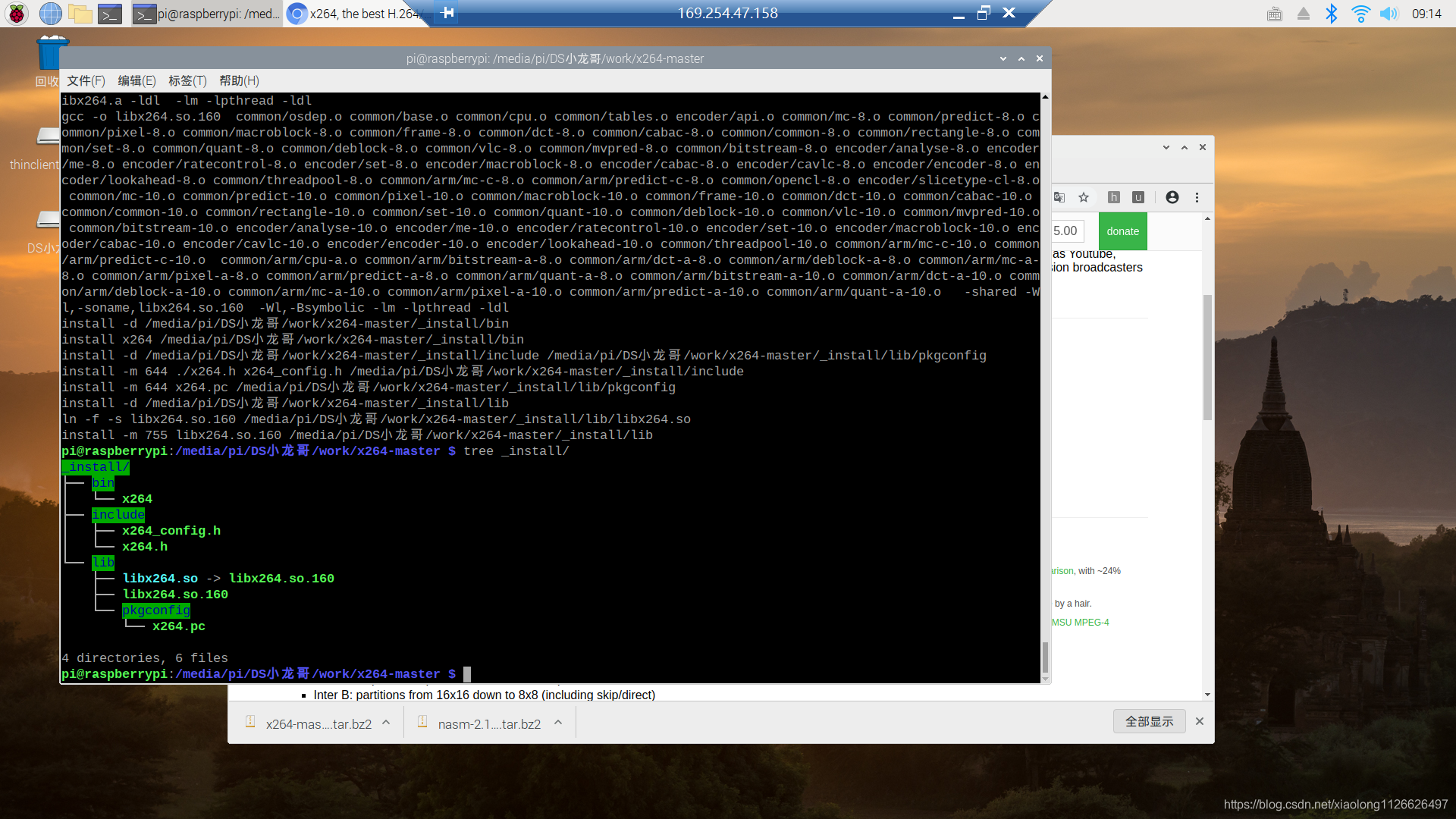 pi@raspberrypi:/media/pi/DS小龙哥/work $ mv /home/pi/Downloads/x264-master.tar.bz2 ./pi@raspberrypi:/media/pi/DS小龙哥/work $ tar xvf x264-master.tar.bz2 pi@raspberrypi:/media/pi/DS小龙哥/work $ cd x264-master/pi@raspberrypi:/media/pi/DS小龙哥/work/x264-maste $  ./configure --prefix=$PWD/_install  --enable-sharedpi@raspberrypi:/media/pi/DS小龙哥/work/x264-master $ make && make installpi@raspberrypi:/media/pi/DS小龙哥/work/x264-master $ sudo cp _install/include /usr/ -rfpi@raspberrypi:/media/pi/DS小龙哥/work/x264-master $ sudo cp _install/lib /usr/ -rf
